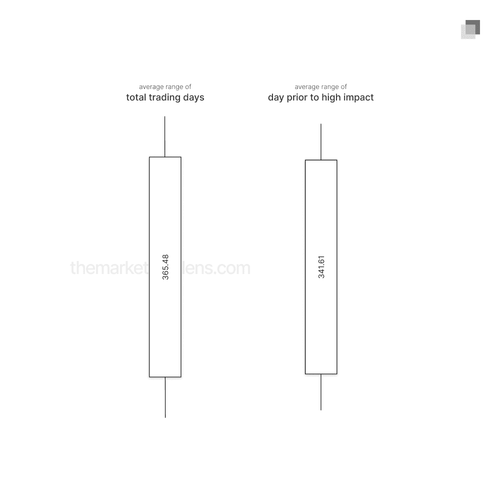 Average daily range for day prior to high impact news event: 341.61 points