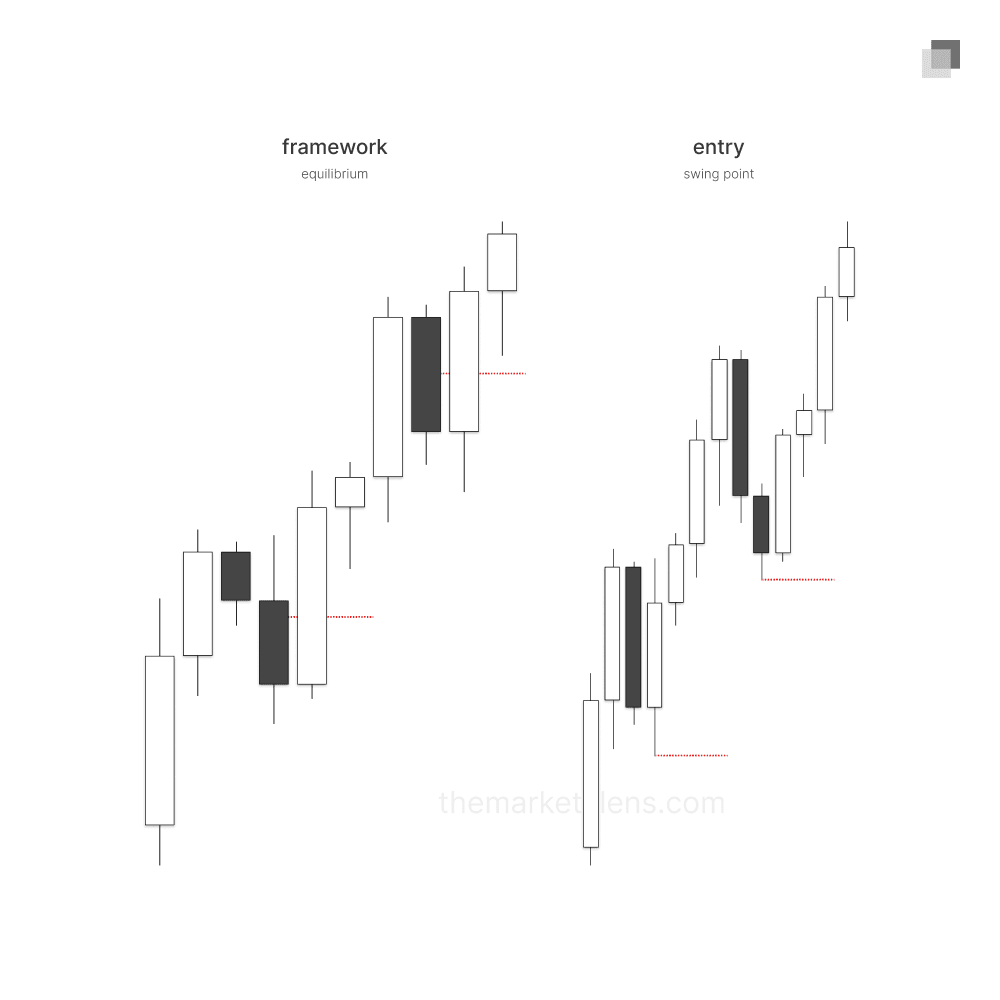 When being used as higher timeframe framework, the invalidation is a close through the fifty percent level from the highest candle body to the lowest candle body. These timeframes are used to frame narrative and confirmation which is favored to see respect of the upper fifty percent of downclose candles when bullish or the lower fifty percent of upclose candles when bearish.