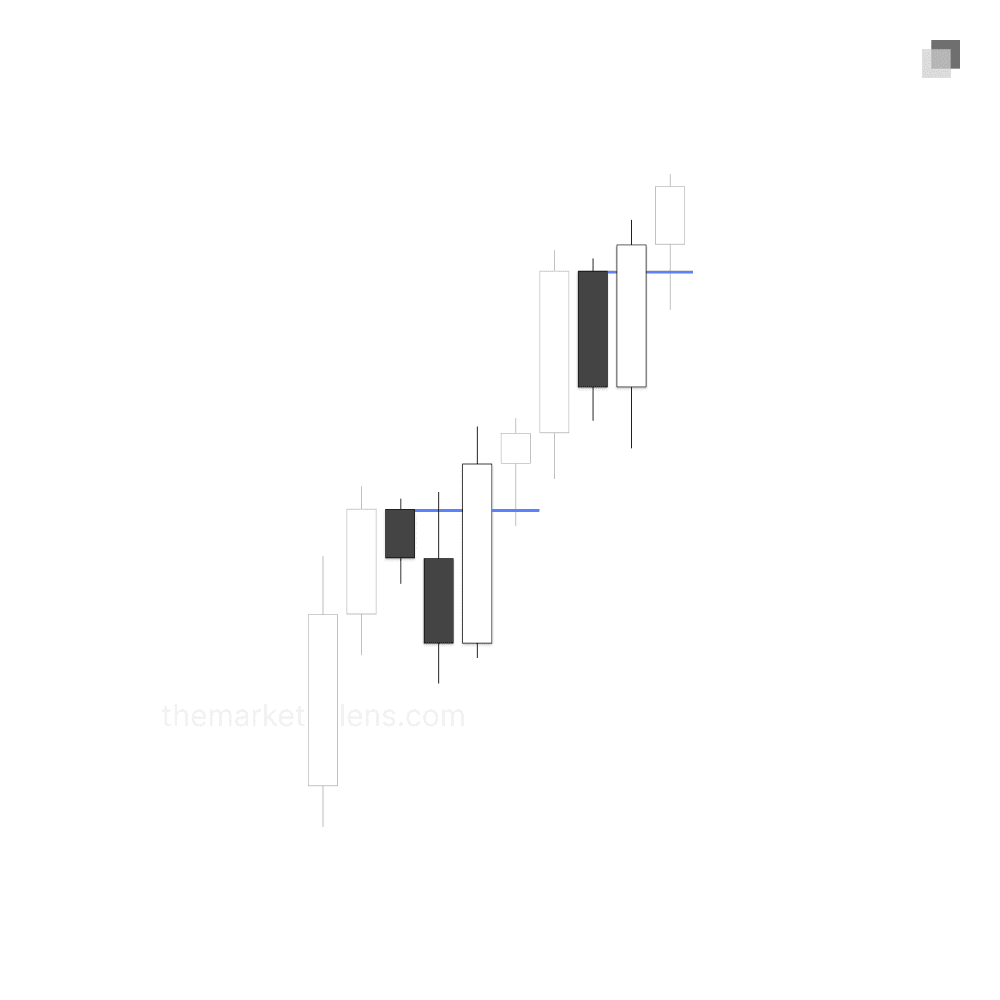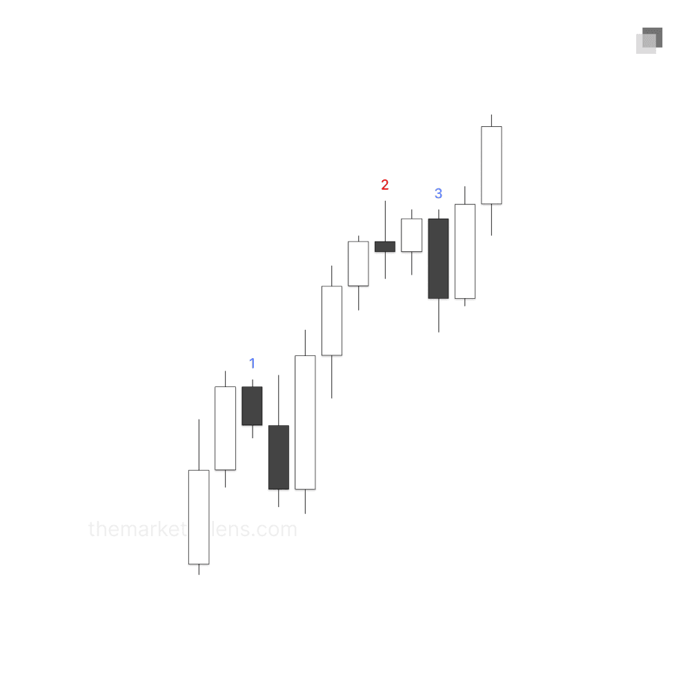 Both a single or series of opposing close candles with a small ranged candle body and wick are invalid. Upon the close through, this does not serve as a confirmation for a protected swing. It is not expected that price will remain in respect to the invalidation point. The scenario below shows how the market does not respect the close above candle two due to the small ranged candle body.