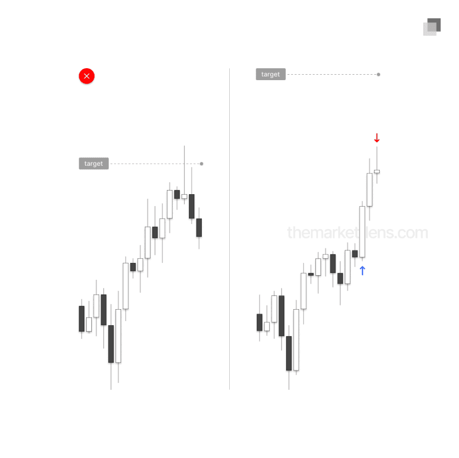 If the market grinds into the objective over a longer period, with deep retracements along the way, it signals weakness and a lower likelihood of sustained continuation. In this scenario, you should consider scaling heavily at the initial target, or even closing the position entirely to secure profits.