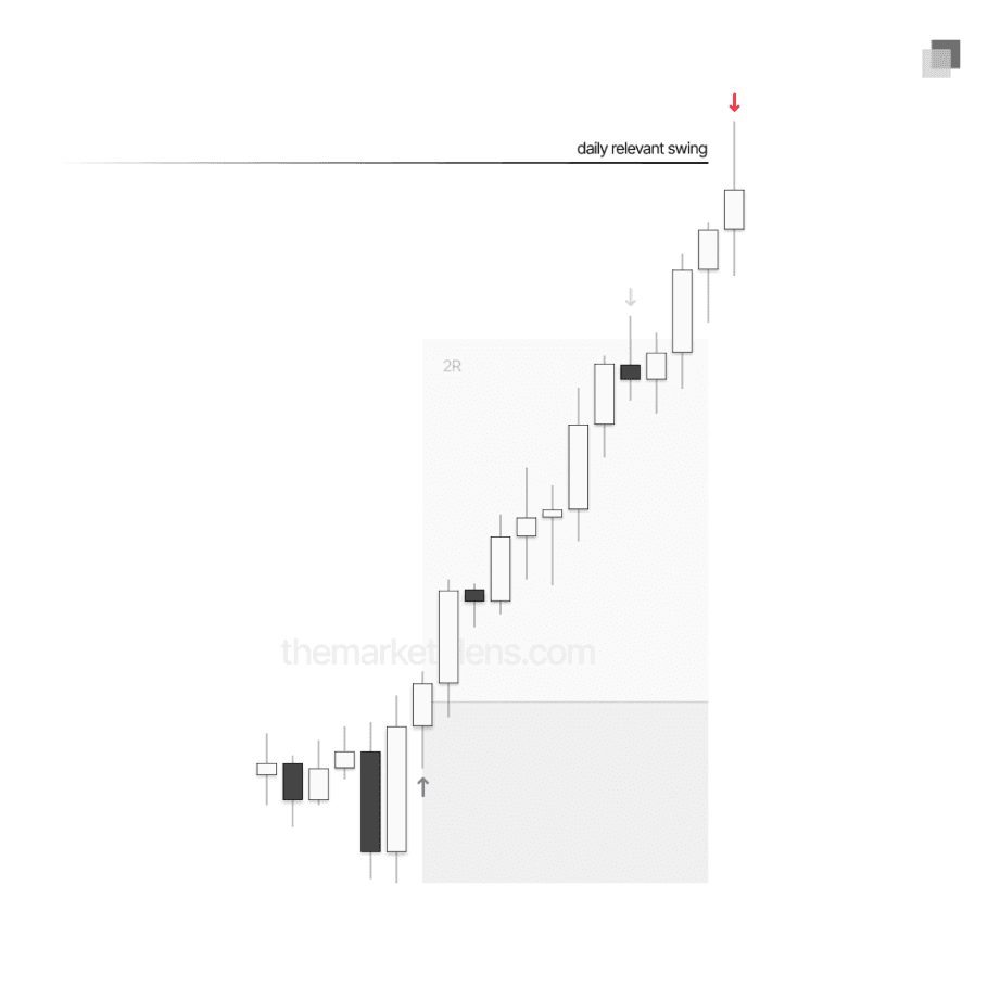 If a daily relevant swing sits beyond your 2R objective but remains within reasonable reach for the current daily candle, you can scale less than average at 2R or even hold the full position toward the swing. This is based on the assumption that price has a high probability of reaching into that level.
