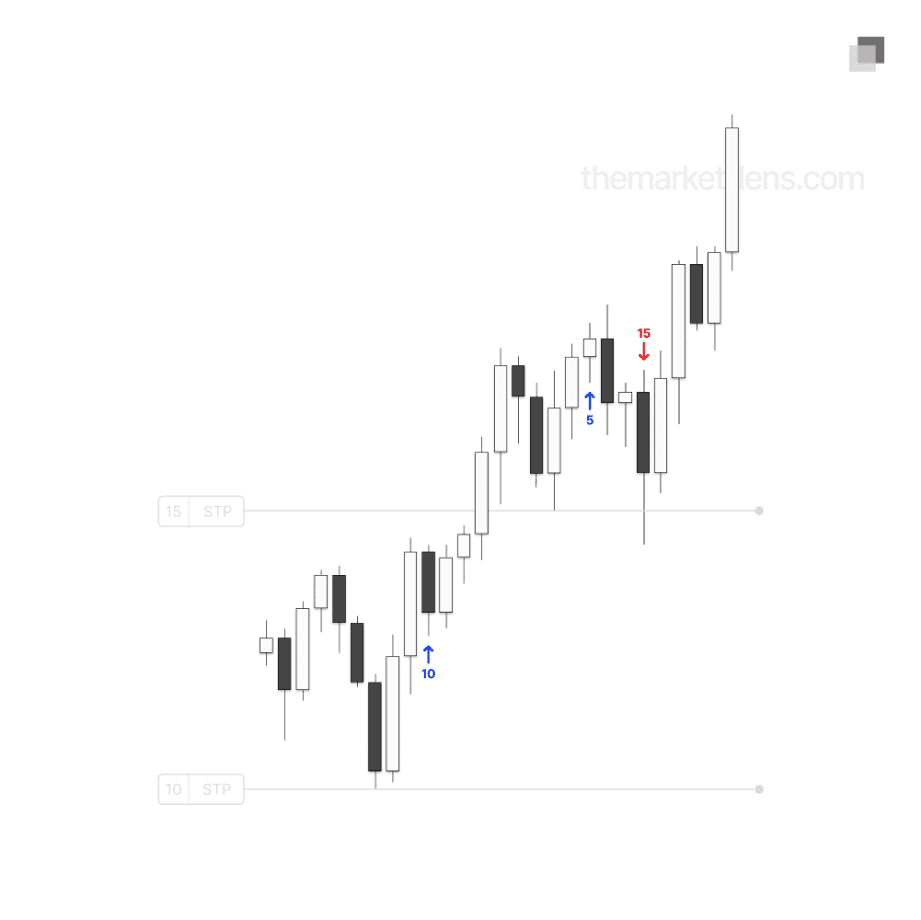 Pyramid entries must also occur before the full expansion of the daily candle is complete. There must be sufficient range left to capitalize on and scale from. Otherwise, the market is more likely to reverse or consolidate, making the pyramid entry unnecessary risk.