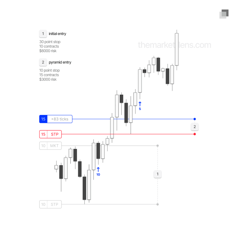 Once contracts are added and the stop loss is trailed, the new dollar risk on the trade must be recalculated based on the larger position size. In a live market, these calculations need to be made quickly, but never impulsively. Pyramid entries place risk management directly on the line, and decisions must remain controlled and backed by a plan.
