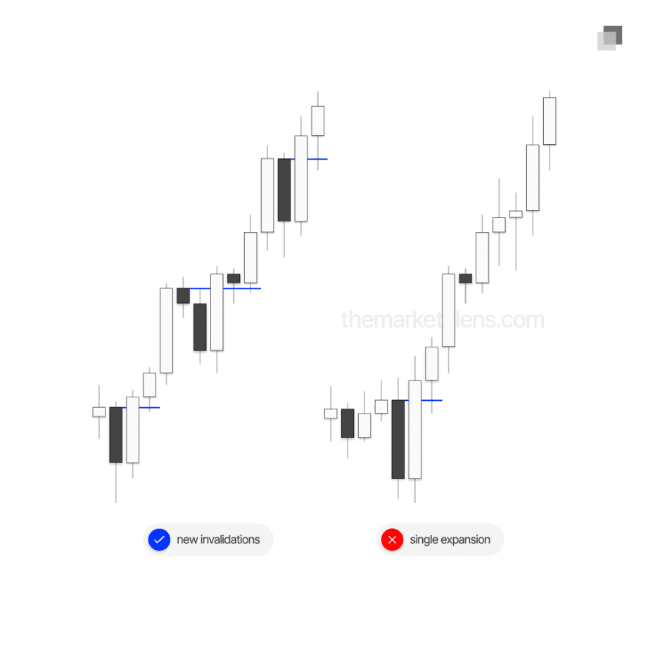 Pyramid entries are only valid when price forms a new continuation signature after the initial entry. Additional contracts can then be added, which will move the average up when long and down when short. The original stop loss is trailed to the invalidation point of the new signature being added to. This is why the same quality and confluence demanded from any entry must also be present for pyramid entries, since the trade is now protected by the trailed stop. A practical mental rule is that if an initial position would not be taken on the signature, then a pyramid entry should not be taken either.