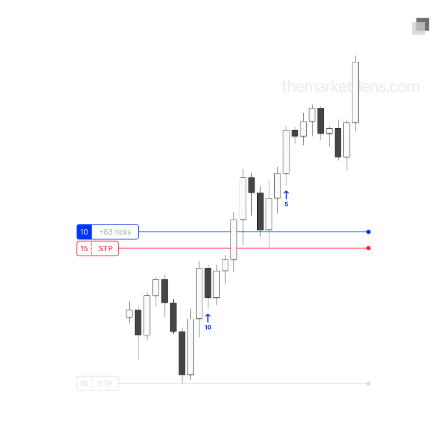Pyramiding a position refers to adding contracts to an open trade that is already moving in profit. This approach allows size to be increased on a winning position without raising the baseline dollar risk. Pyramid entries are optional and will not appear in every trade, but when they do, they can be a valuable tool for scaling profitable positions.