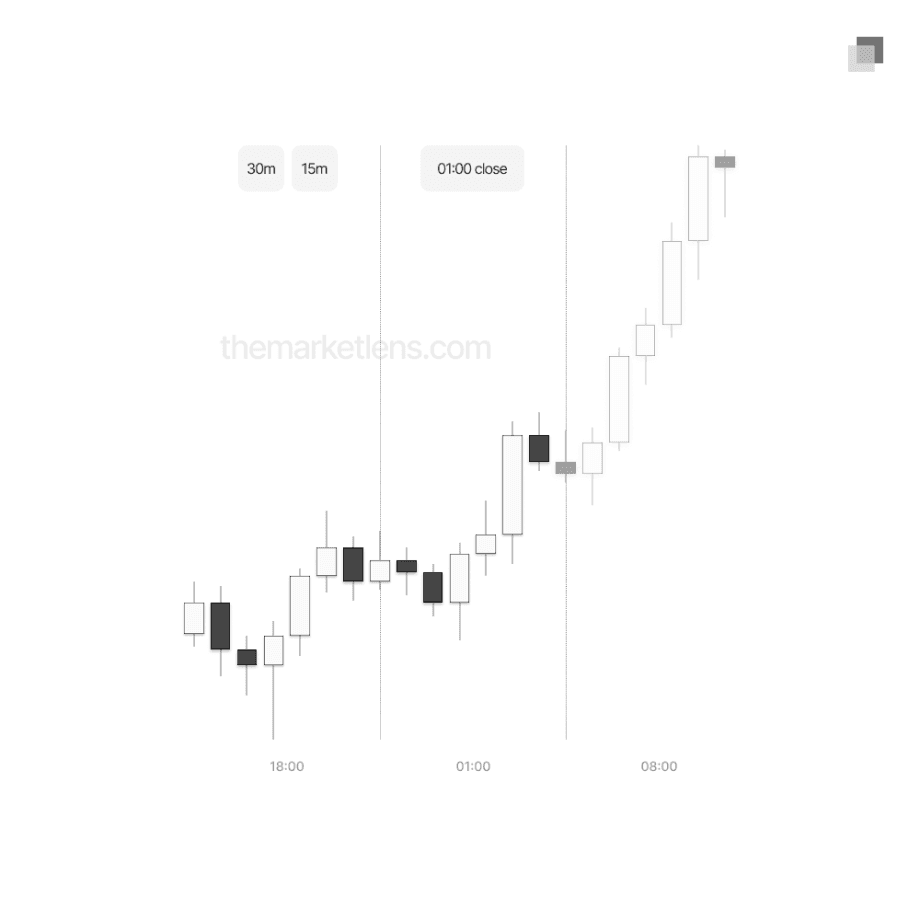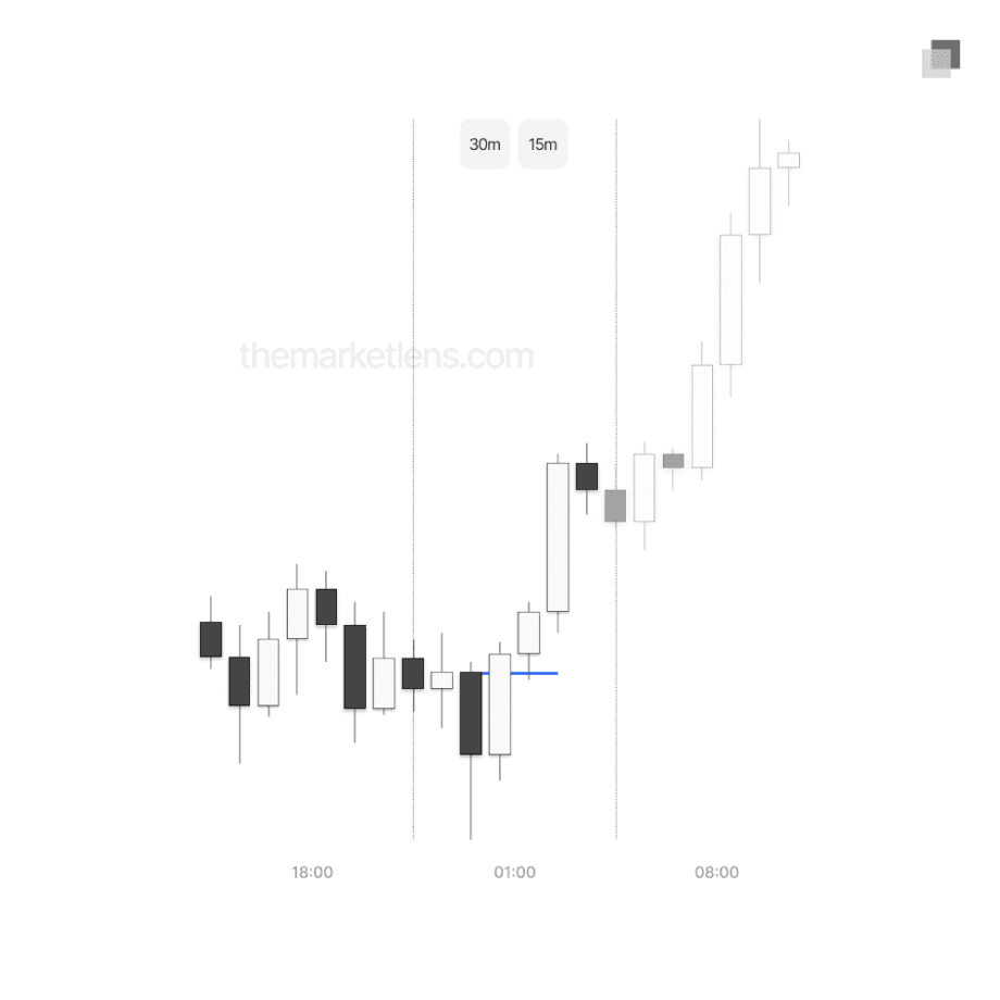 When the daily profile is a 01:00 reversal, the focus is on identifying a change in state of delivery on either the 30-minute or 15-minute timeframe. This signature acts as the reversal confirmation and establishes the intraday reversal, which no longer needs to be traded back to. A higher timeframe alignment is used during the London session as it has reduced average volatility.