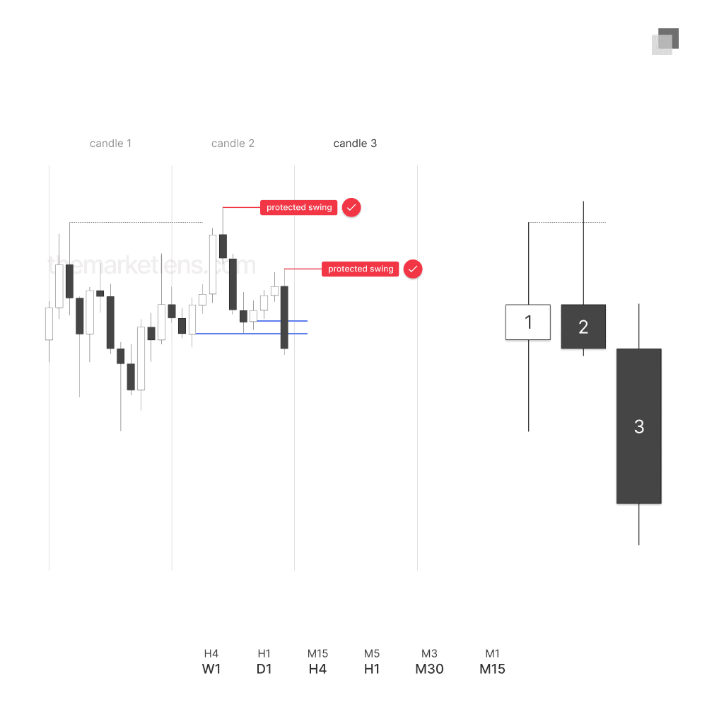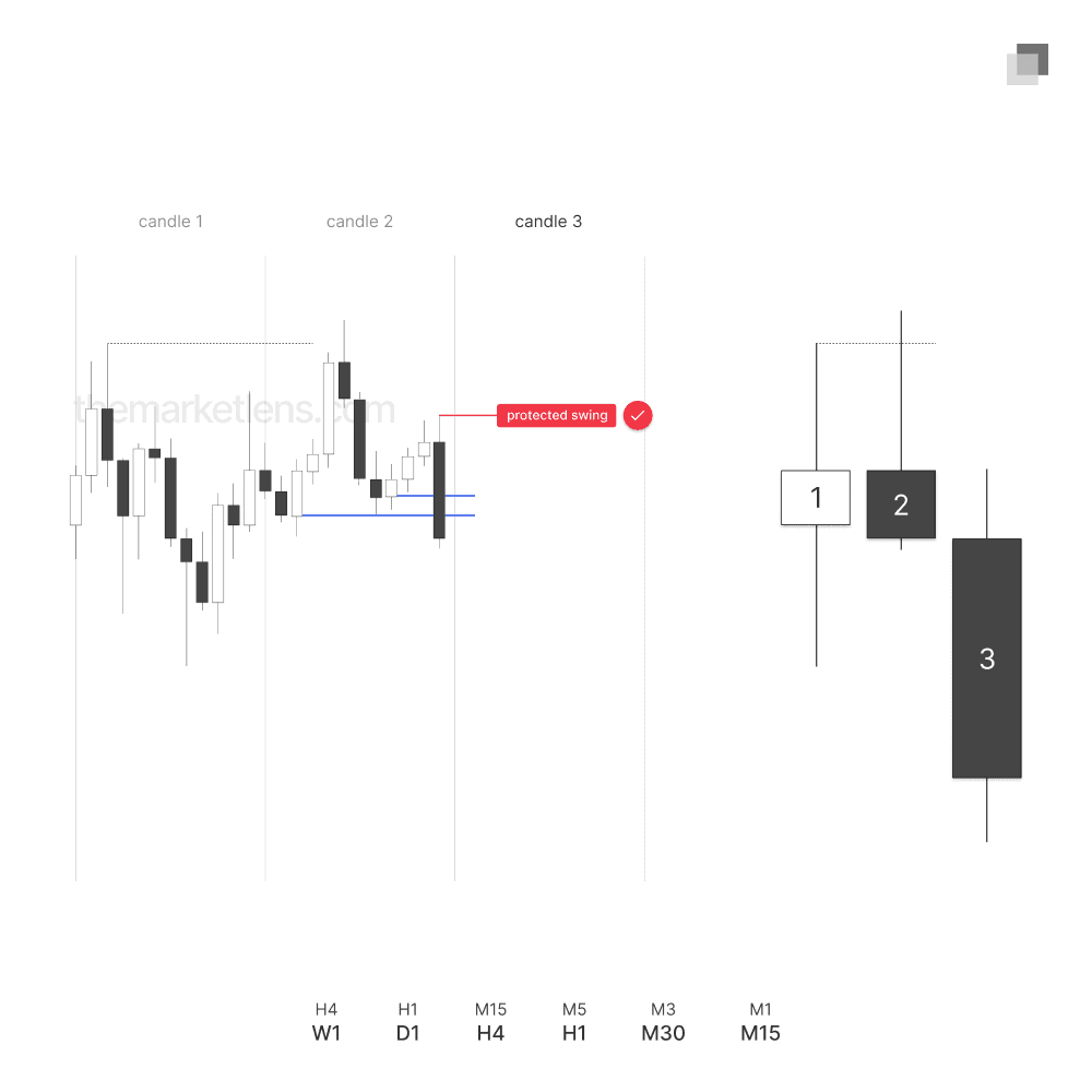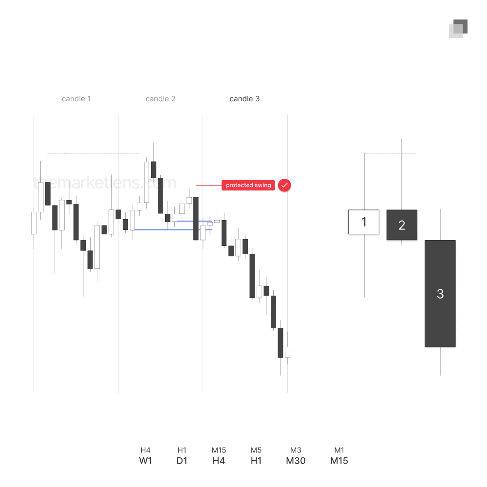 If both conditions are met, the invalidation level going into candle 3 can then be refined to the most recent protected swing.