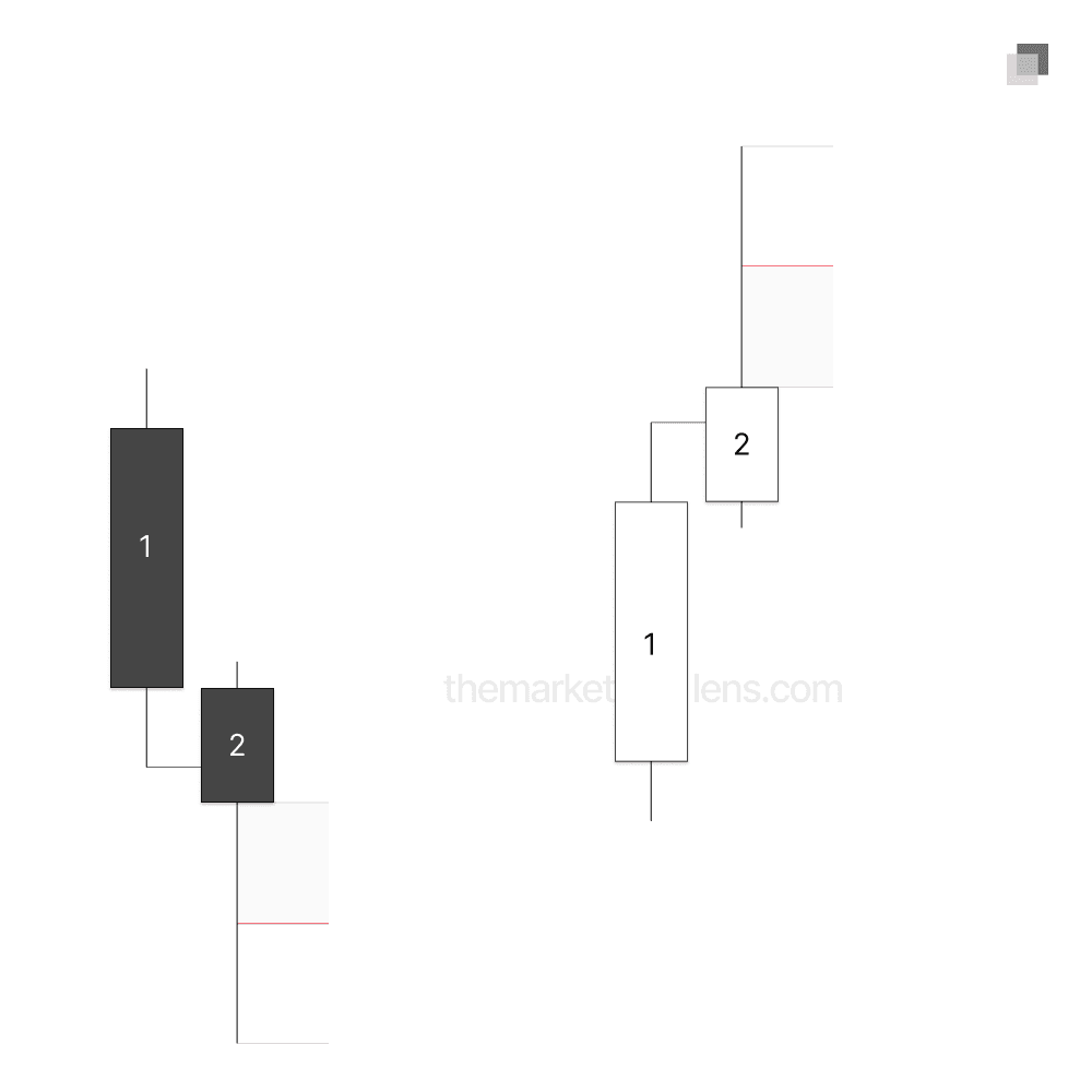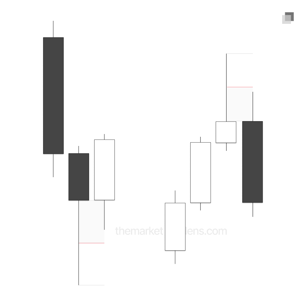 In some scenarios, price will reverse without producing a candle 2 closure. For example, here price forms a reversal candle with a large wick but fails to close back inside candle 1’s range. In this case, a candle 3 continuation can still be anticipated. If candle 3 respects the 0.5 level of candle 2’s wick, it can be traded as a continuation.