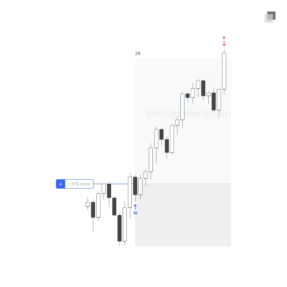 Contrary to the previous example, when the market shows little willingness to expand and price action is lethargic, the best approach is to take the full position off at 2R. In this type of environment, further expansion beyond the targets is unlikely, so securing the entire profit at 2R is the most practical decision.
