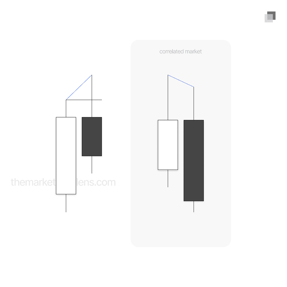 Double SMT occurs when there is SMT between candle 1, candle 2, and candle 3 on the higher timeframe. In this scenario, the correlated asset fails to take out the high of candle 1 but successfully takes out the high of candle 2.