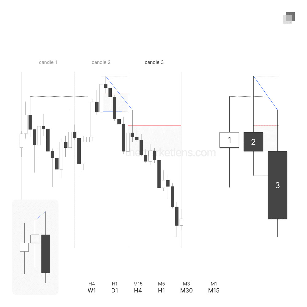 Reversal SMT occurs when there is SMT between candle 1 and candle 2 on the higher timeframe, and the correlated asset fails to take out the high of candle 1.