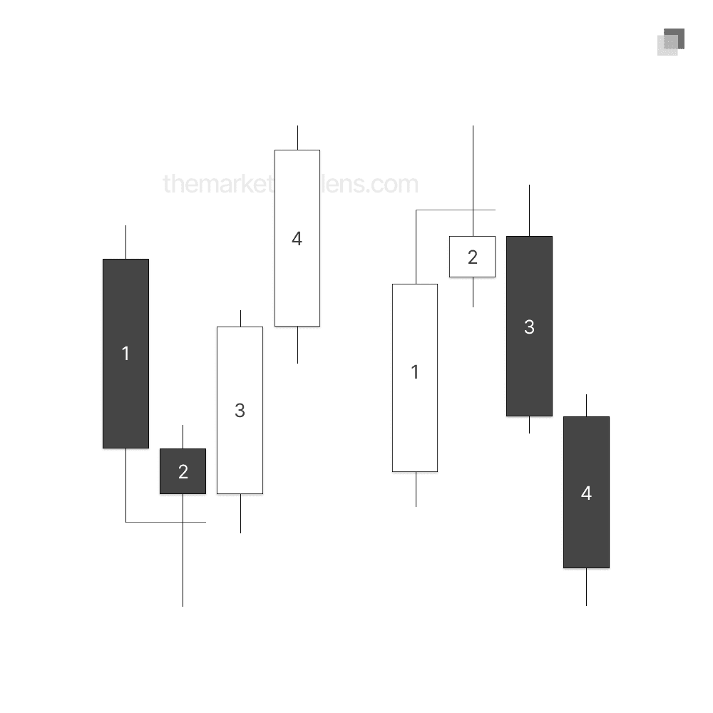 In this example, candle 3 exhibits an expansion higher closing outside the range of candle 2. Referring to the closures lesson, this allows for the anticipation of a further continuation in candle 4.