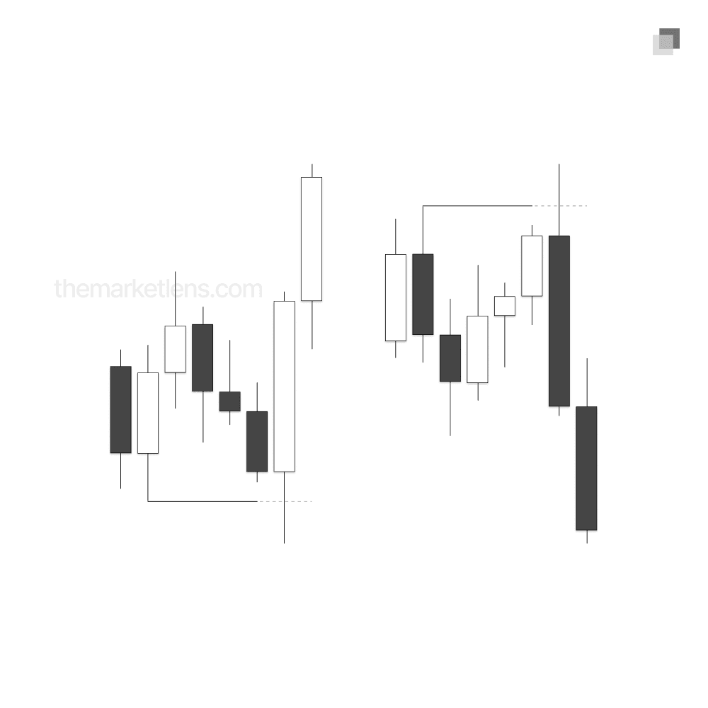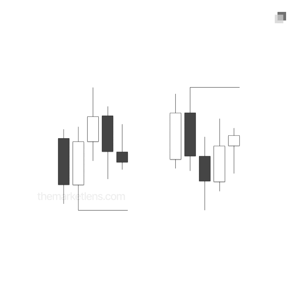 What are highs and low? Highs and lows are swing points within the market. A high is defined as a candle with a lower candle on both its right and left, while a low is defined as a candle with a higher candle on both its right and left.