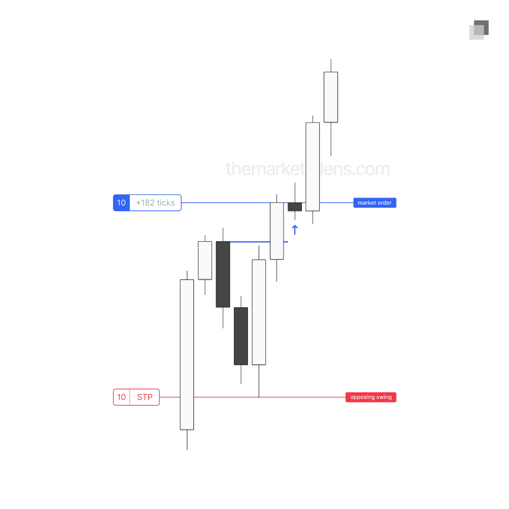 In this example, price reaches into the fair value gap and, importantly, does not close above the T-spot level. The entry sequence has formed, consisting of a swing formation followed by an opposing candle. This opposing candle formation within candle 3 represents the IC-CISD and confirms the development of the higher timeframe wick in candle 3. At this point, an entry can be taken with the stop placed on the protected swing, targeting an expansion move of 2R.