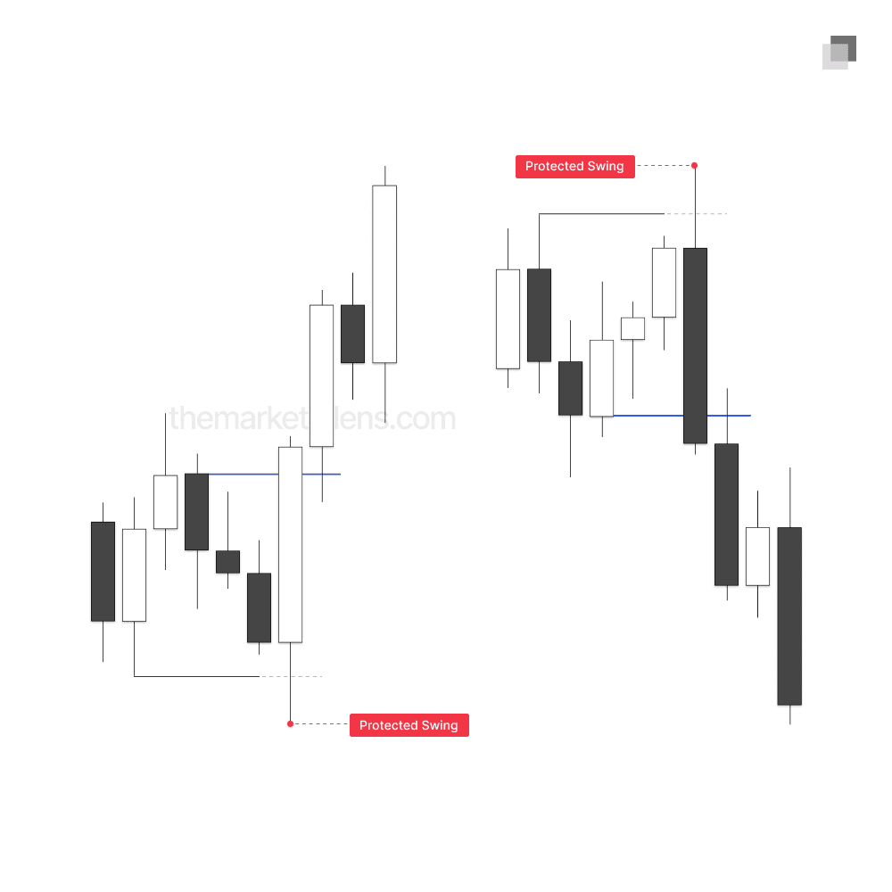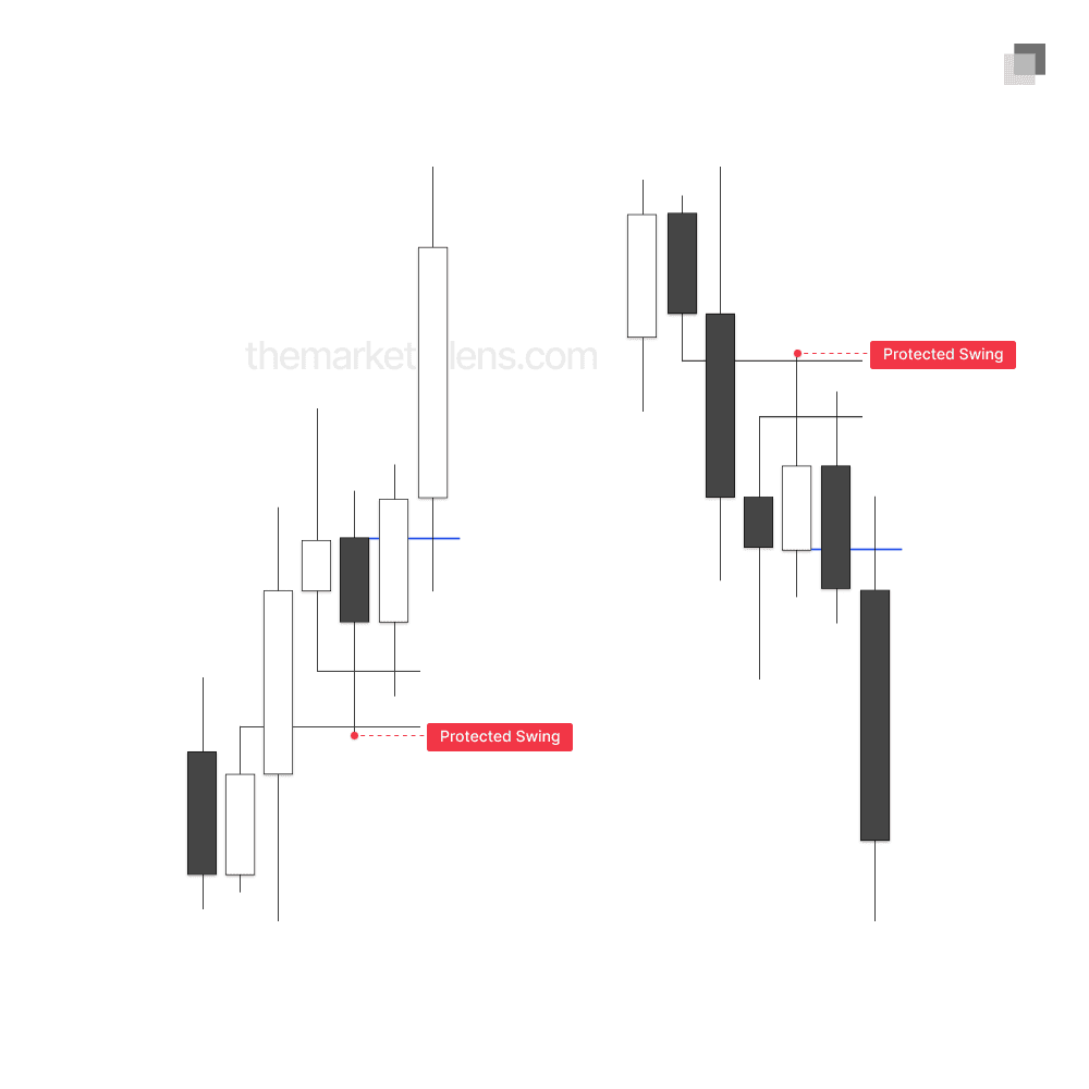 Protected swings are opposing candles formed from a point of interest, after sweeping a high or low or entering a fair value gap. Protected swings provide a defined invalidation level from which traders can structure trades away from. A protected swing forms after a high or low has been swept, as illustrated in the example below.