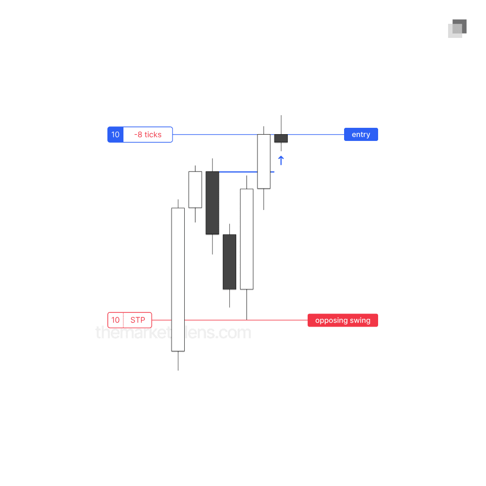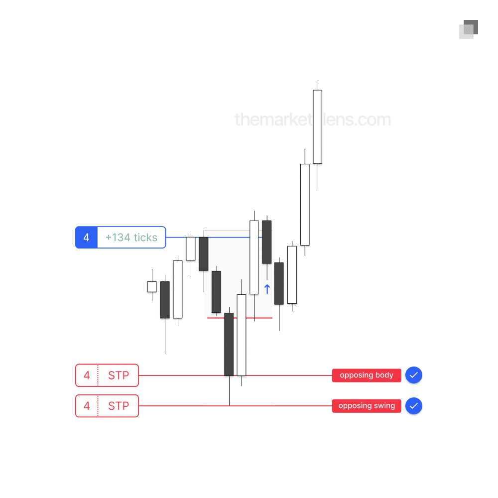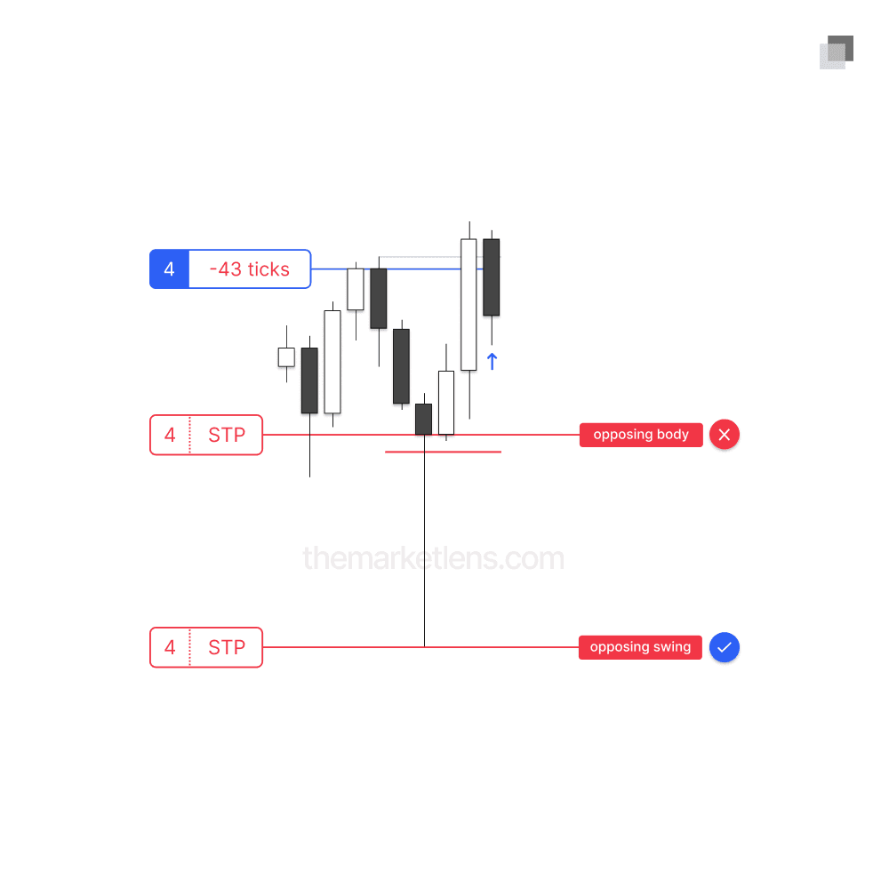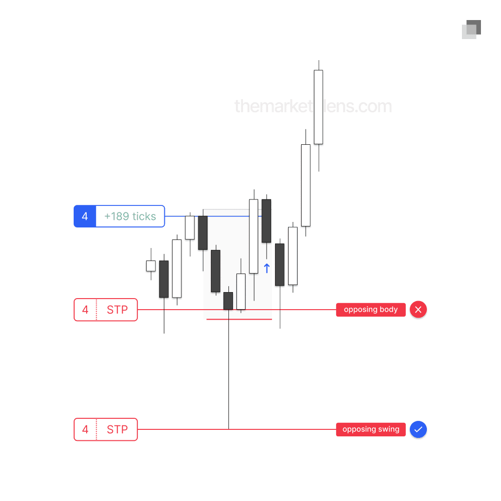 A body invalidation means that the stop loss is placed at the body of the protected swing. This placement increases the trade’s risk-reward ratio but carries the trade-off of not representing the true invalidation point.