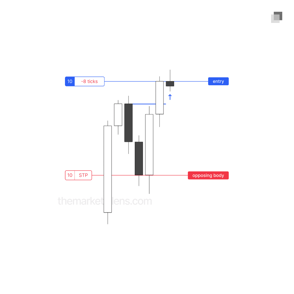 In the scenario below, there is a larger opposing run with smaller bodies. By marking out the opposing run and 50% of it, it becomes clear that placing the stop loss at the body does not extend beyond the 50% mark. This makes the body invalidation invalid in this case, requiring the use of the swing invalidation. If this placement does not provide sufficient risk-reward, it is advisable to wait for a continuation entry.