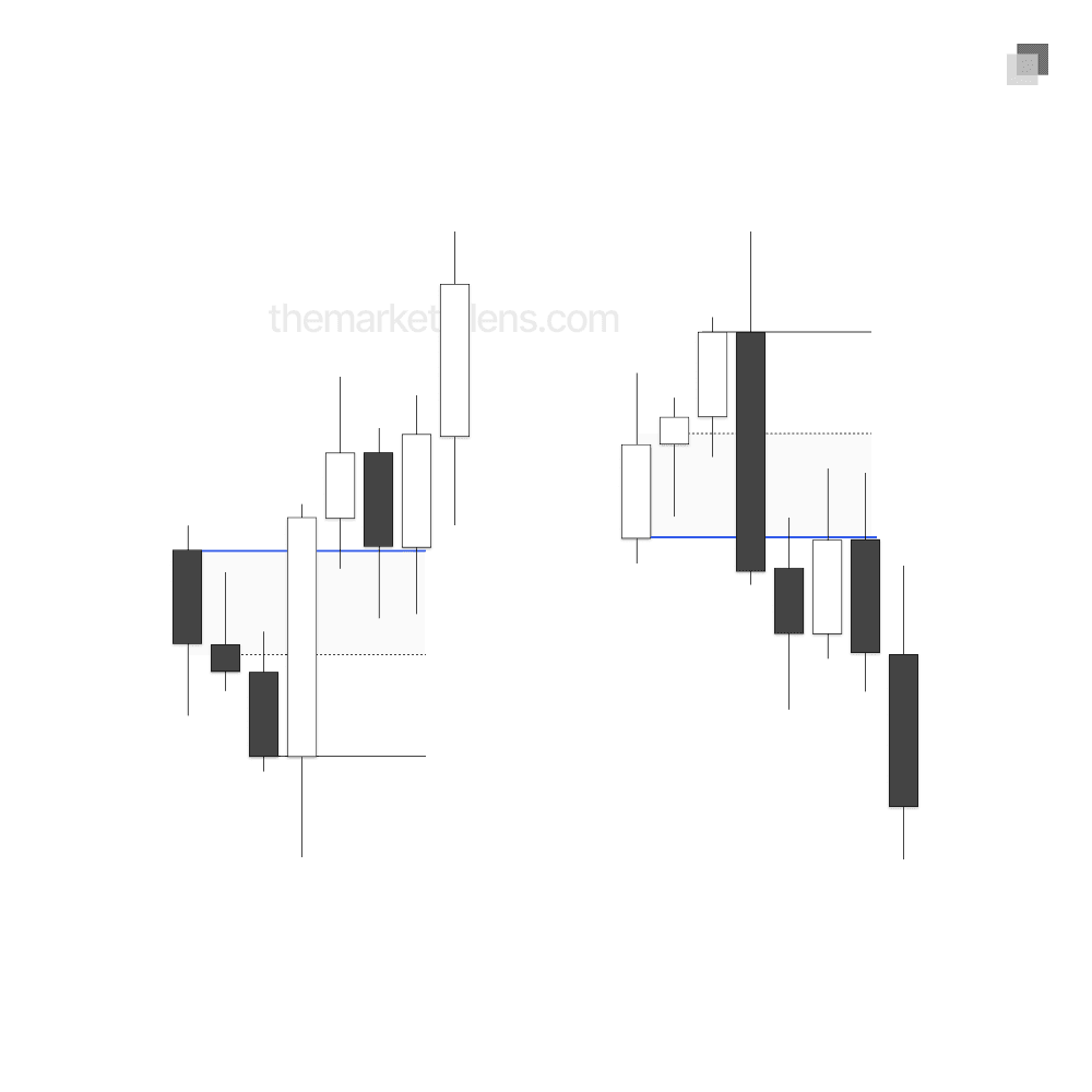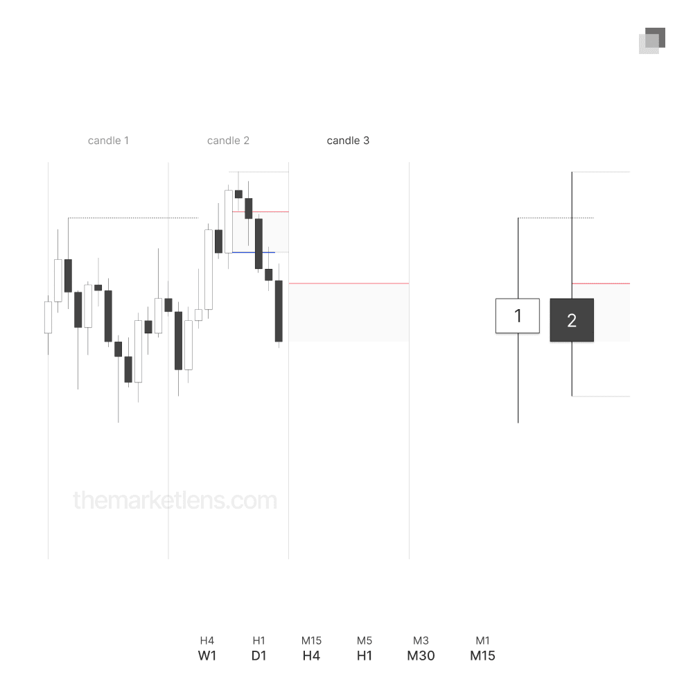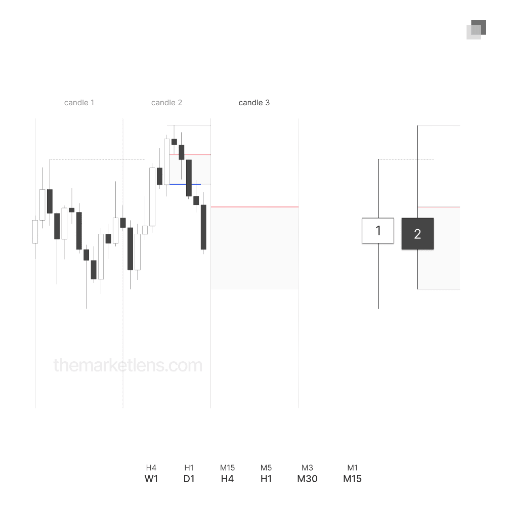 With only the equilibrium marked, the final rule requires adjusting the equilibrium rectangle to align with the opening price of the new candle. This adjustment is necessary because the wick is expected to form within this area, and it is not possible for price to create its upper high below the candle’s opening price.