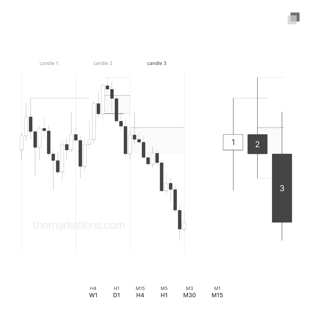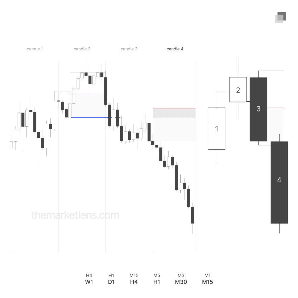 With the T-spot fully marked, this is the area where we expect the wick in candle 3 to form. It is important to note that while it is ideal for price to remain below this level, the critical requirement is that price does not close above it. If price closes above the T-spot, the setup is no longer valid for anticipating expansion.