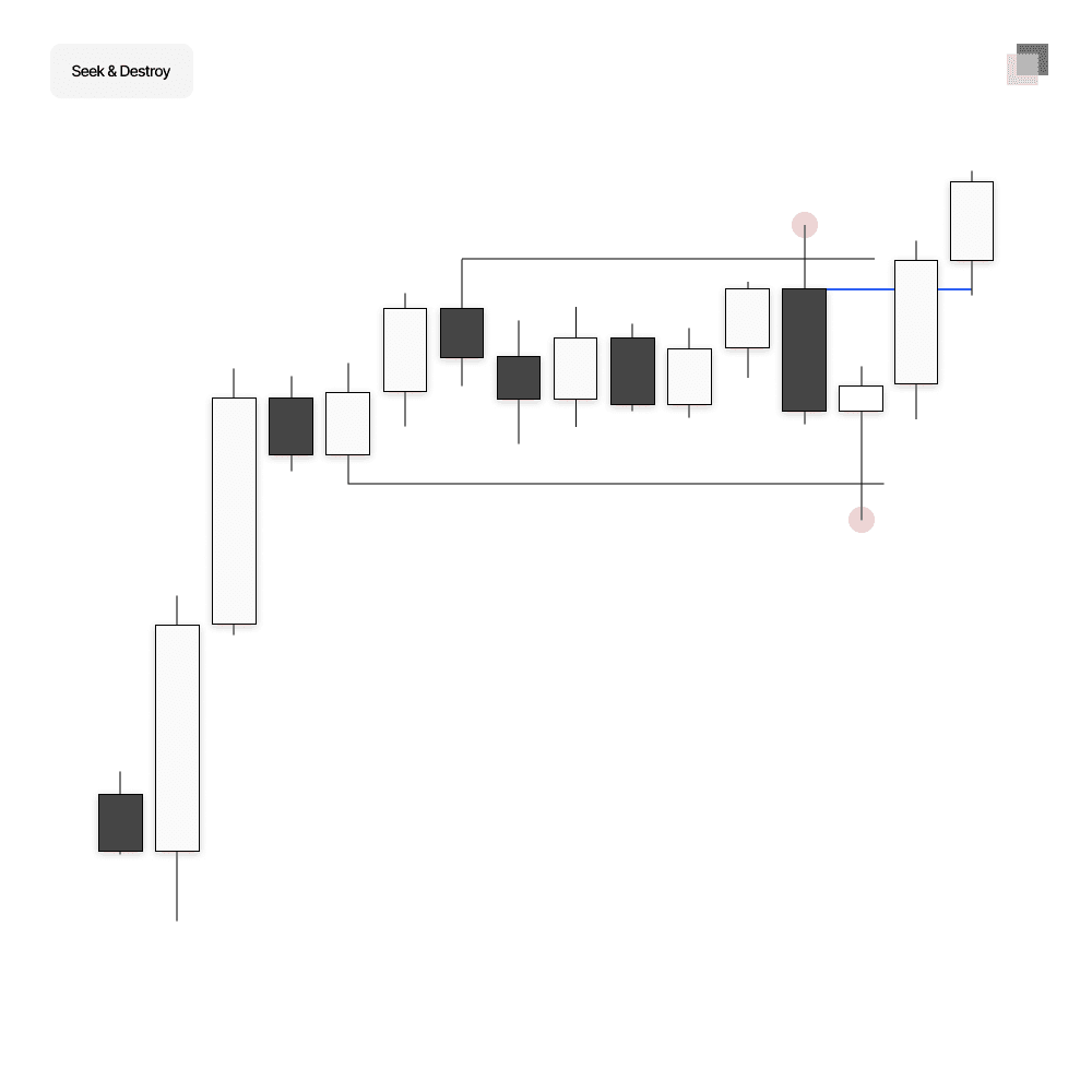 If price expands and consolidates, then manipulates the high first, look for a reversal at the consolidation low to confirm a seek-and-destroy expansion for market continuation.