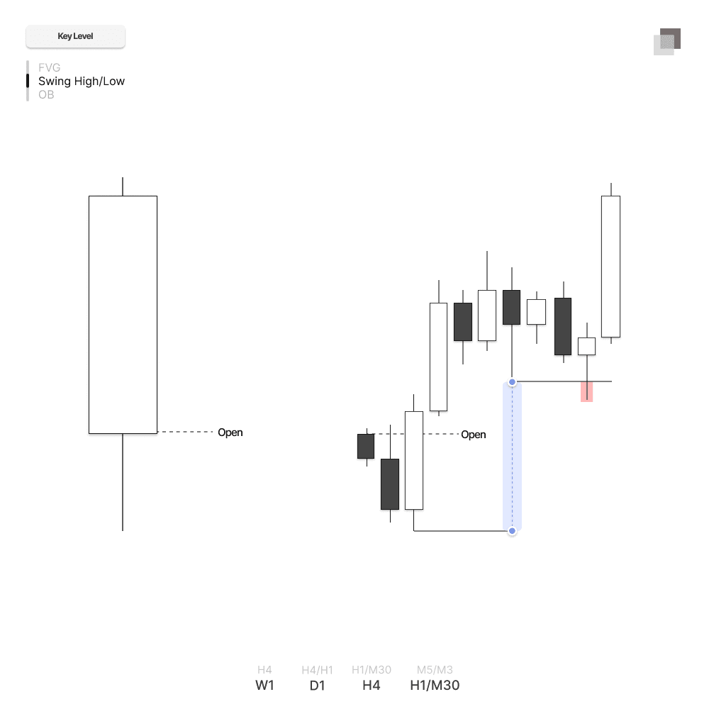 When the candle expands away from its opening price, it forms a swing high/low within its range that can be used for continuation. The swing high/low also serves as an invalidation level. If price fails to reject it, continuation is unlikely.