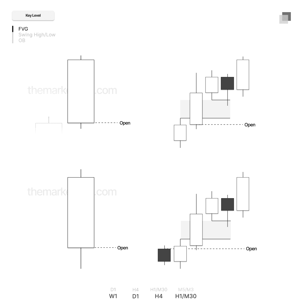 When the candle expands away from its opening price, it forms a fair value gap (FVG) within its range that can be used for continuation. The FVG also serves as an invalidation level. If price fails to respect it, continuation is unlikely.