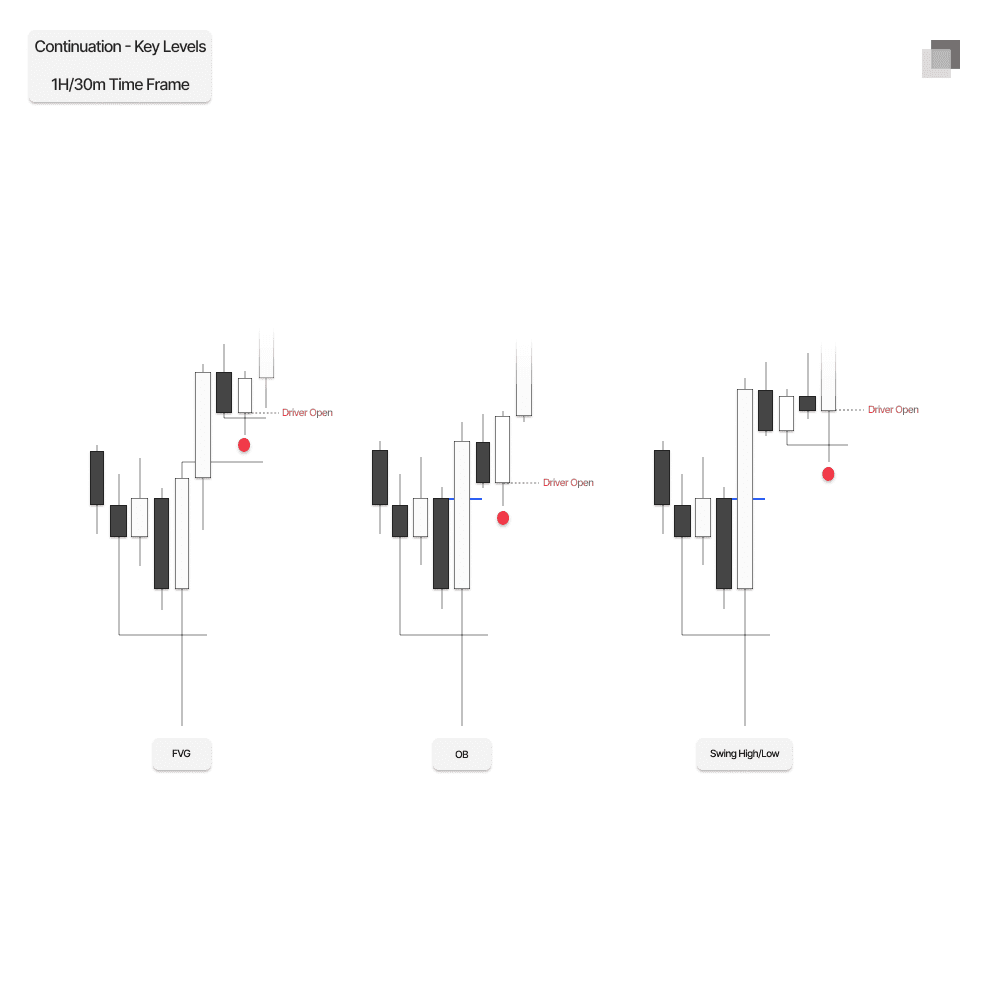 Pair a driver with a reversal off a 1H/30m key level within daily continuation.
