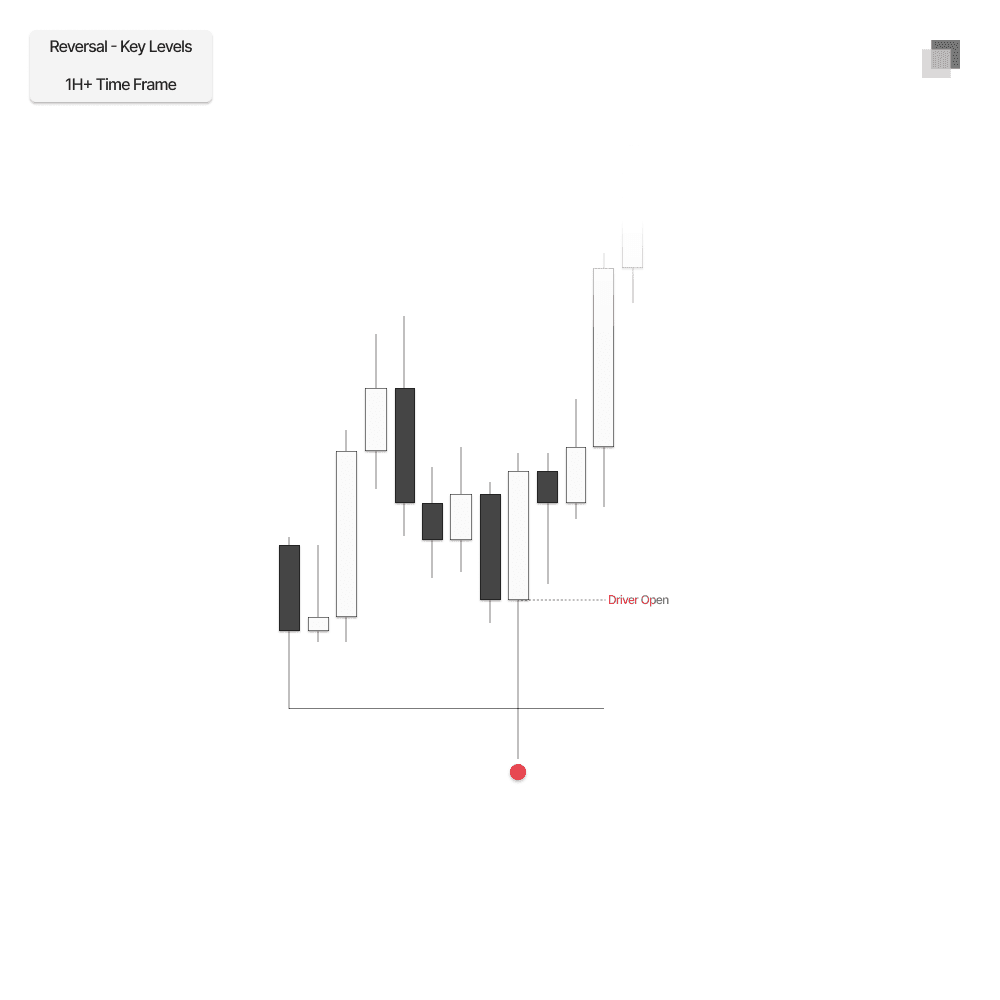 Pair a driver with a reversal that establishes the LOD/HOD from a 1H+ key level.
