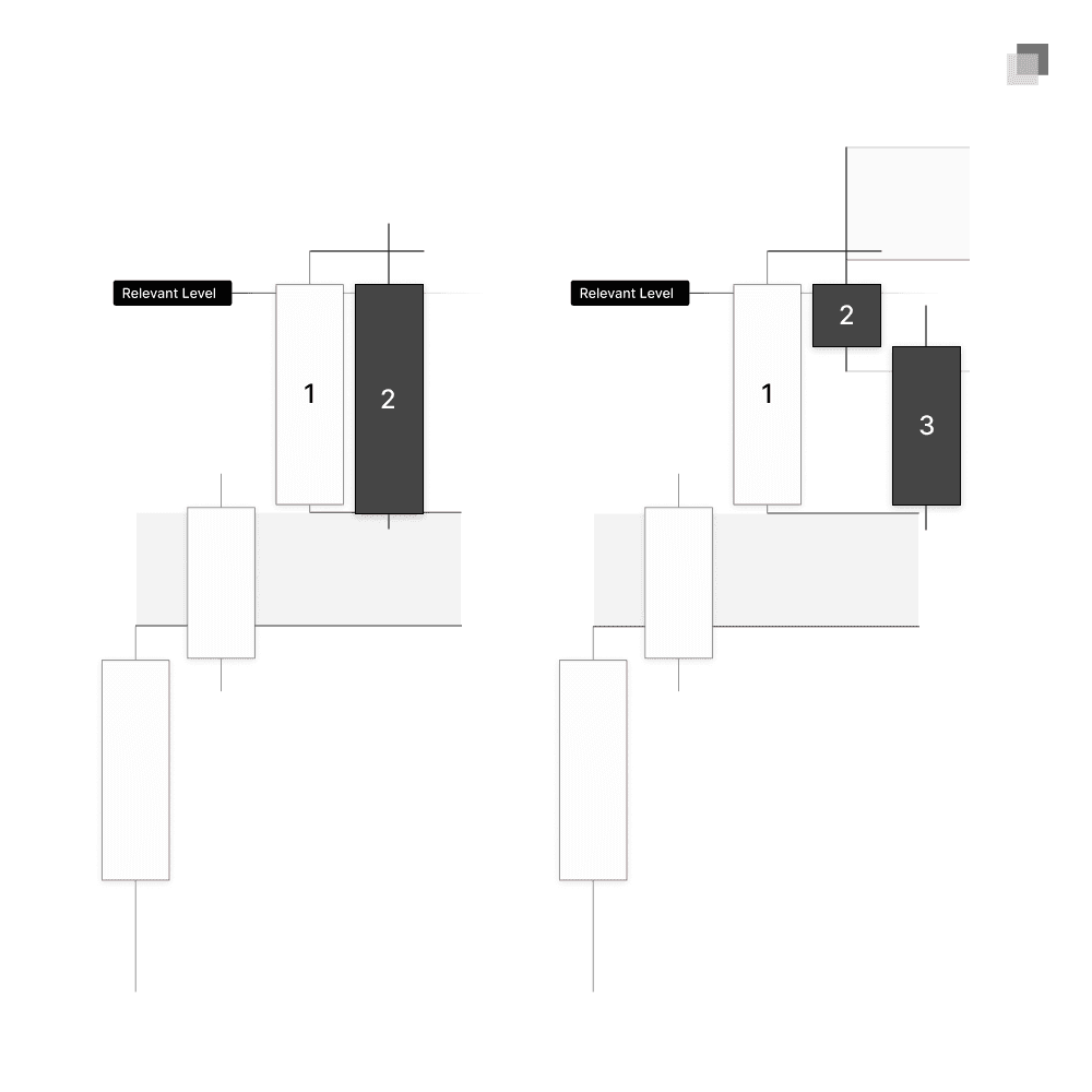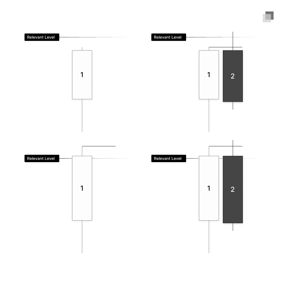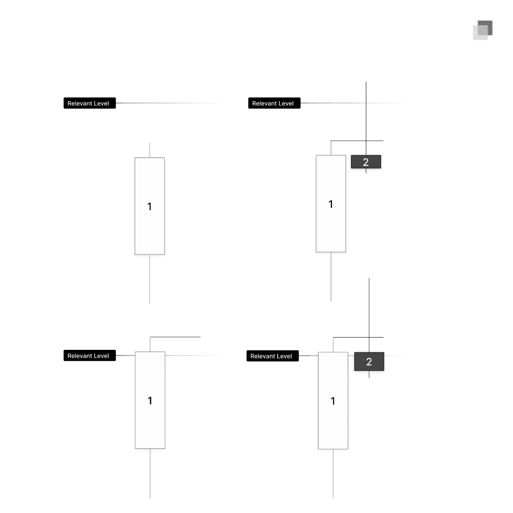 If Candle 2 opens near a key level, it will open high, sweep Candle 1’s high into the key level, then reverse creating a small wick, which allows price to reverse and expansion in the same candle.