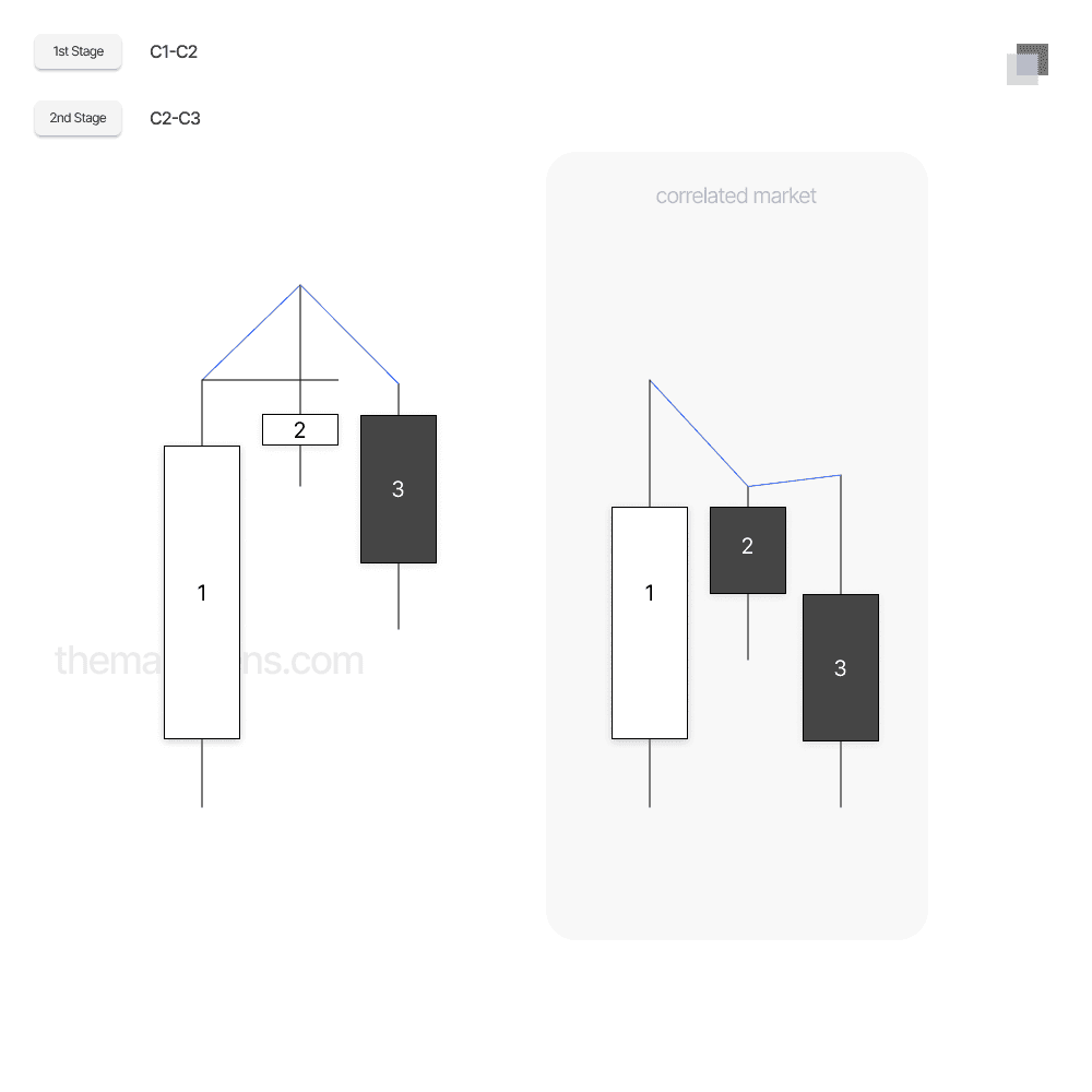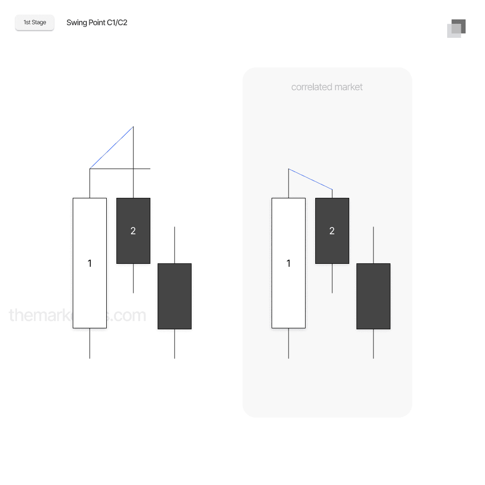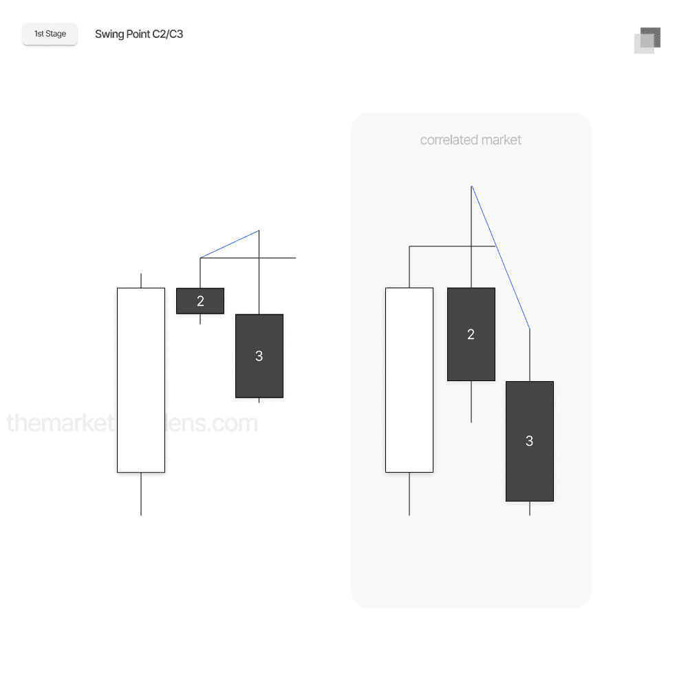 SMT occurs when there is a divergence between Candle 1 and Candle 2 on the higher timeframe, followed by another divergence between Candle 2 and Candle 3, creating a two-stage SMT within the swing formation.