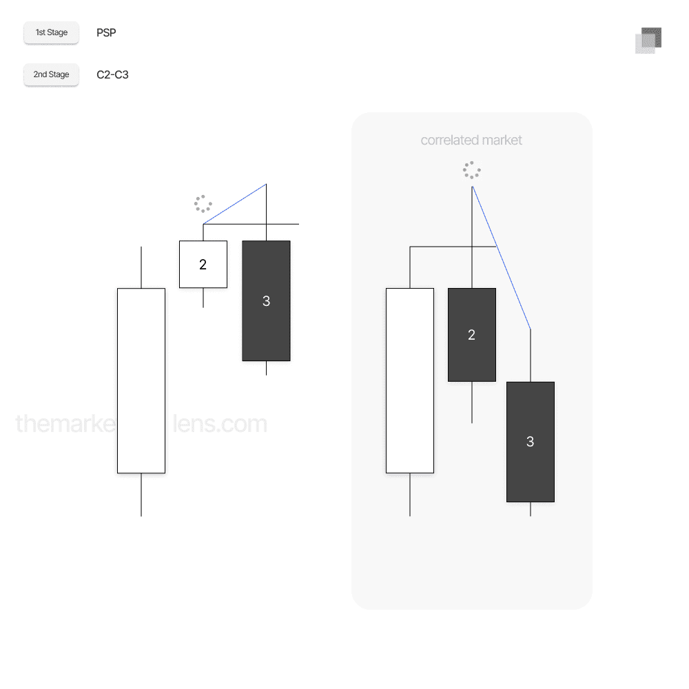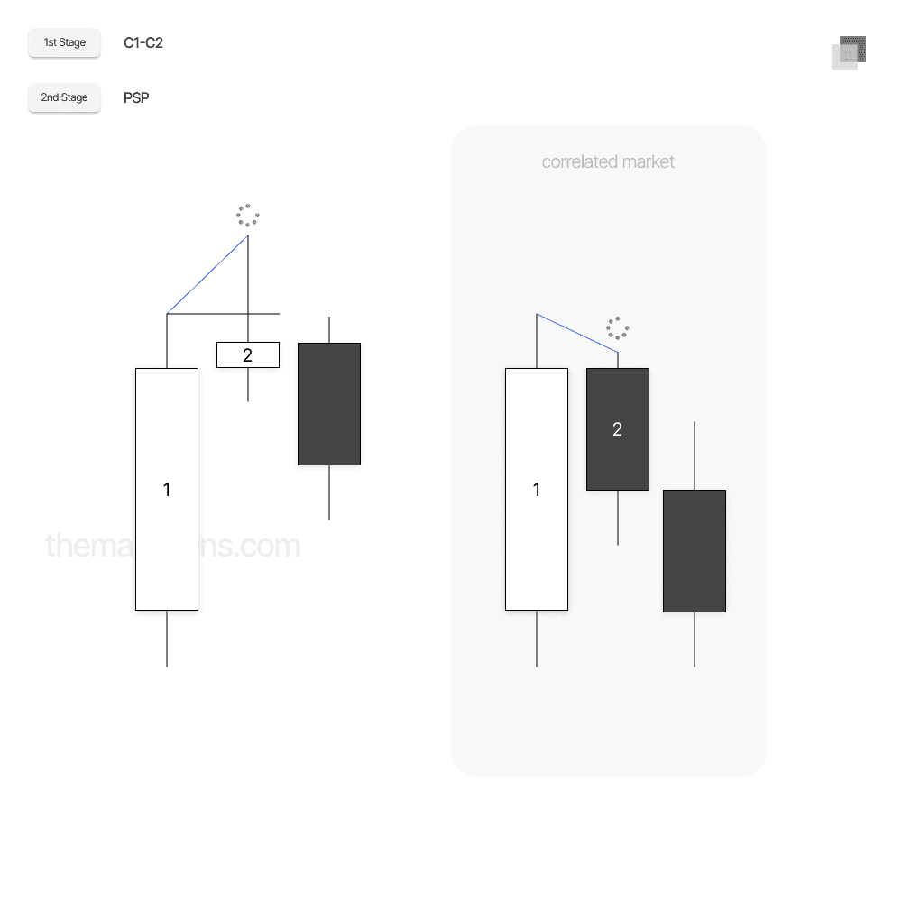 Within continuation, price will form a PSP, then reverse from the PSP high, creating a C2 candle and forming a two-stage PSP.