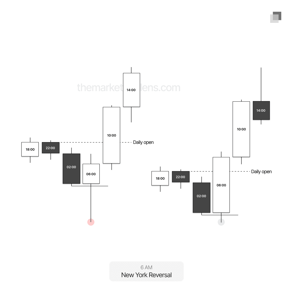 Once the New York session hits a relevant level, seek the 6:00am 4H reversal into expansion candle. This candle reverses off the previous candle's high or low, forms a wick, and then expands away, creating the low or high of the day (LOD or HOD). If the 6:00am 4H candle does not support expansion, trade the 10:00am 4H continuation.