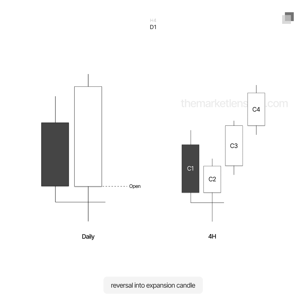 When profiling a daily candle, we look for a 4H swing formation to confirm the low of the day. This aligns the daily and 4H timeframes in the same direction.