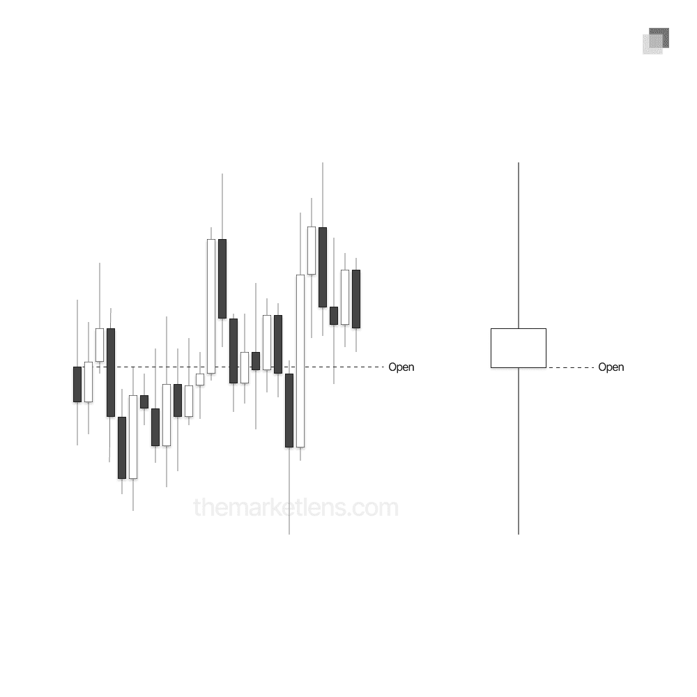Indecision candles open and close near the same price, indicating periods of market consolidation. In this profile, there is no clear candle pattern because there is no distinct open, low, or high, and no follow-through movement. This reflects a lack of market direction and shows that traders remain indecisive during these periods.